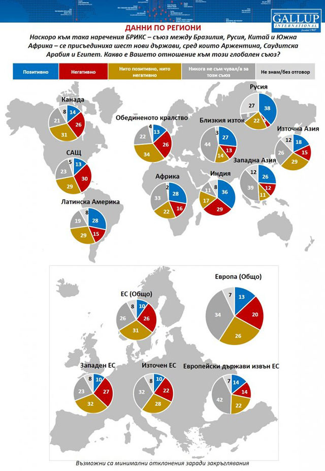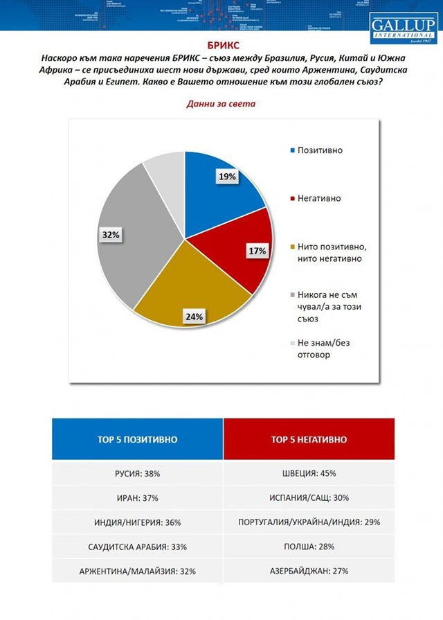 Близо една трета от жителите на света в никакъв случай не са чували за БРИКС - това разкрива световно изследване, извършено от Световната асоциация " Галъп интернешънъл ", представително за мнението на към 4 милиарда души в 44 страни от света. Позитивните и отрицателните настройки към БРИКС са съвсем равни дялове (19% положителни и 17% негативни). Една четвърт (24%) са неутрални, а един от всеки трима (32%) в никакъв случай не е чувал за съюза, заяви " Галъп Интернешънъл ", представяйки .