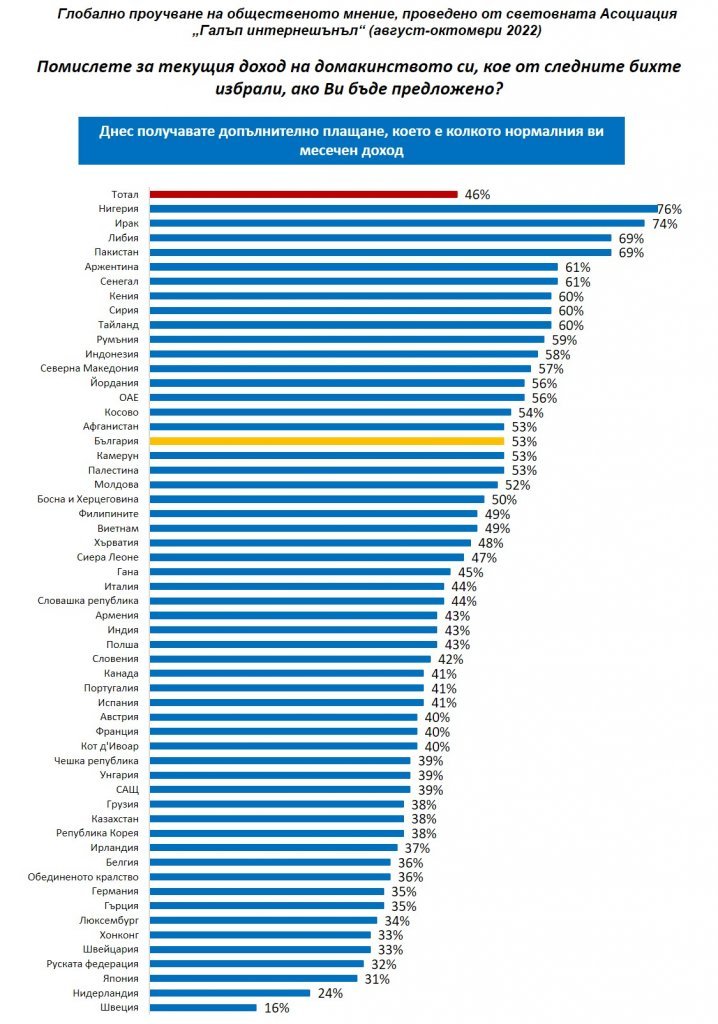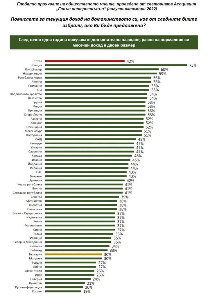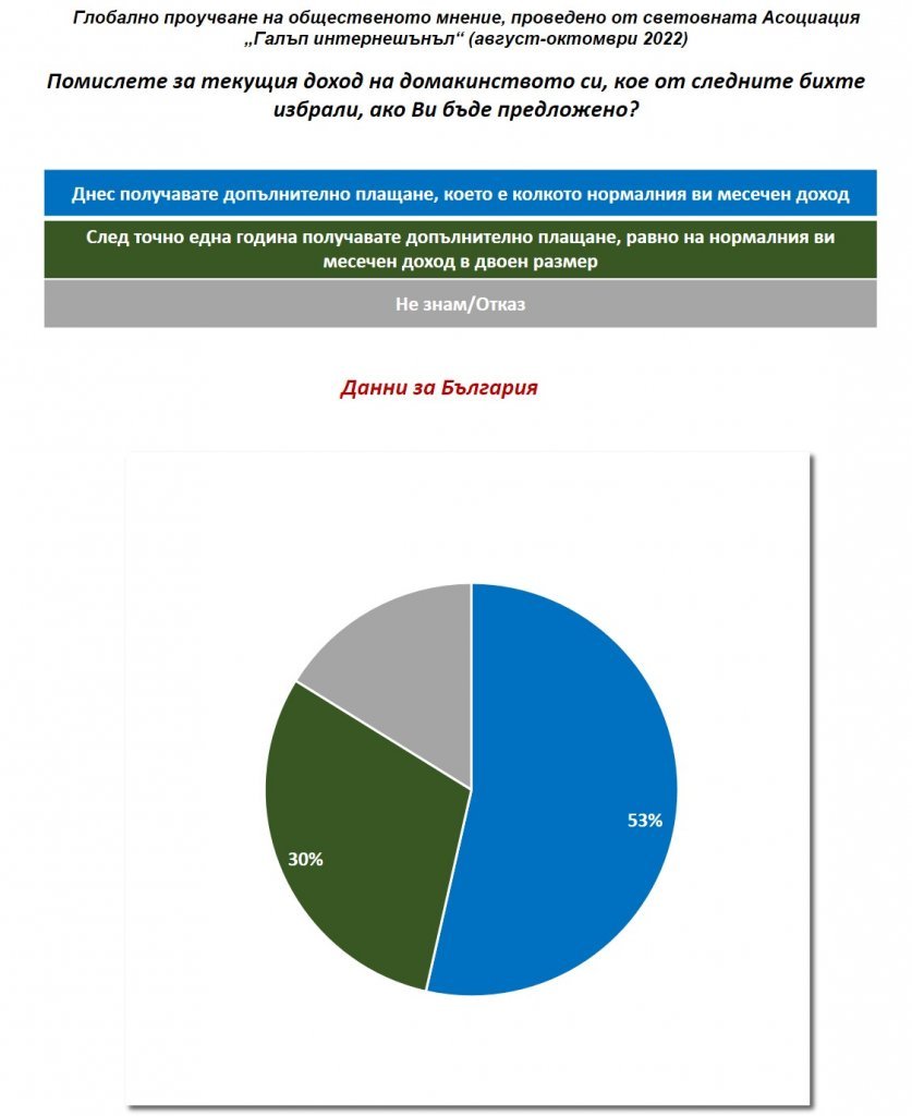 Проучване на „ Галъп интернешънъл “ за настройките на жителите за приходите им сочи, че 53% от българите избират да получат еквивалента на една месечна заплата през днешния ден, а 30% биха предпочели двойно заплащане, само че след една година. Останалите не могат да преценяват. Данните са част от специфична изследователска стратегия в 56 страни по целия свят. Програмата отбелязва 75-ата годишнина от основаването на Световната асоциация „ Галъп интернешънъл “.