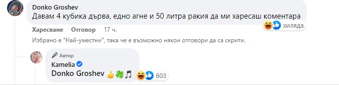 " Давам 4 кубика дърва, едно агне и 50 литра ракия да ми харесаш коментара ", написа Донко Грошев под горещите фрагменти на русокоската. Е, не знаем на кого ще дава зестрата, но ще би трябвало да извърши обещанието си, защото изпълнителката на " Луда по тебе " освен хареса поста му, само че даже и разяснява със занимателни емотикони.