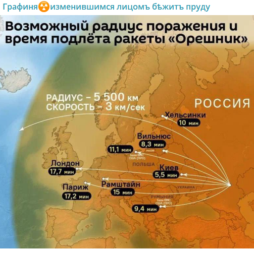В интернет към този момент се появи карта, която демонстрира до кои градове може да стигне Орешник, в случай че бъде изстрелян от полигона Капустин Яр, ситуиран в югозападната част на Русия. На него са маркирани осем евентуални цели, указващи времето на идване на ракетата.