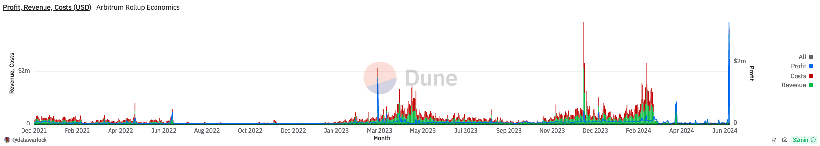 Пускането на LayerZero (ZRO) на 20 юни доста усили таксите в мрежата на Arbitrum (ARB), което докара до рекорден дневен доход от $3.43 милиона, отбелязвайки 16,680% нарастване по отношение на предходния ден.