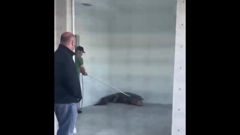 Видео, снимано в резиденцията на мястото - където къщите костват над 1,5 милиона $ - демонстрира двама мъже, които се мъчат да извадят алигатора от вкъщи с въже.