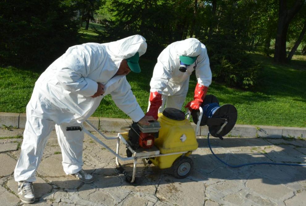 Те почистват тревните площите от кърлежи и други вредители в парк " Ямача " .