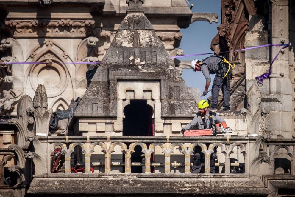 Работници укрепват с дъски поддържащата структура над една от фамозните стъклени розети в парижката катедрала " Нотр Дам " след опустошителния пожар при започване на седмицата, съобщи Асошиейтед прес.