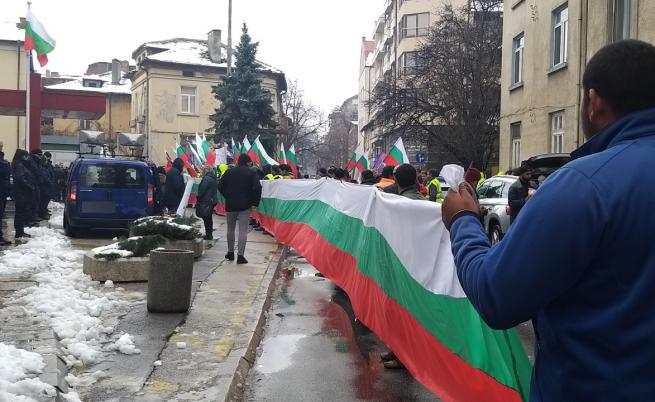 В началото на митинга протестиращите алегорично "опаковаха " районното министерство като разпънаха пред постройката българското знаме, дълго над 100 метра.