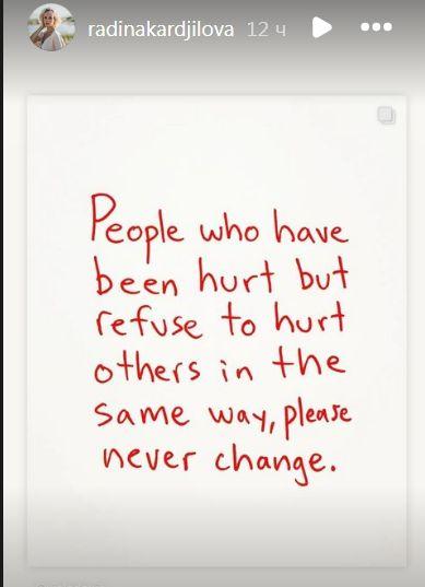 С този откъс, преведен от британски, Радина недвусмислено съобщи, че отхвърля да играе неговите игри и няма желание да влиза в медийна война с бащата на децата си.