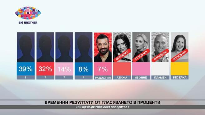 Радостин се раздели с Къщата на Big Brother на крачка от огромния край, който ще бъде излъчен на следващия ден от 20:00 ч. по NOVA. Той получи 7% от вота на феновете, дали своят вот в. Първият в класирането за момента има 39% от вота, вторият - 32%, третият - 14%, а четвъртият - 8%.