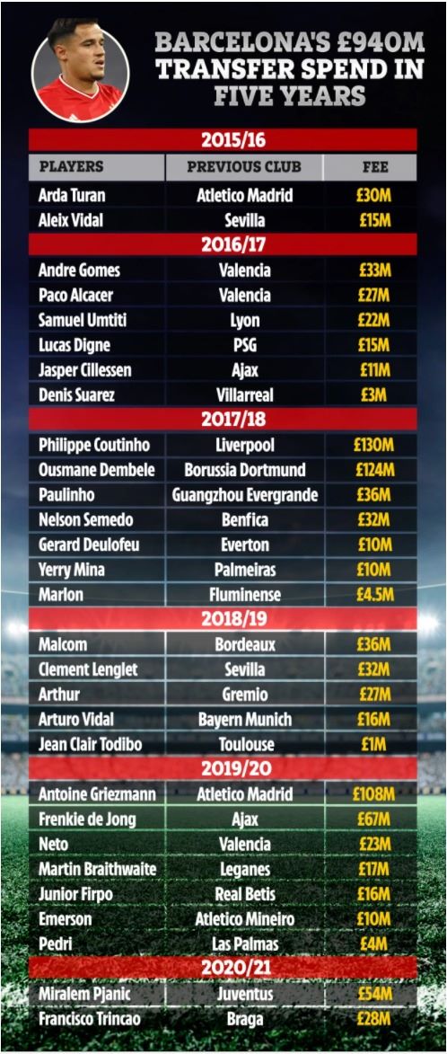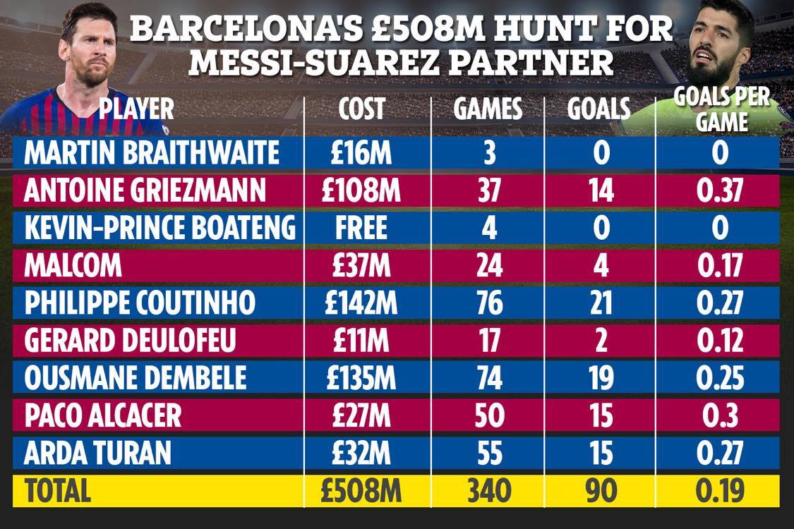 През лятото на 2019-а на „ Камп Ноу “ дойде Антоан Гризман за 120 милиона евро. От упоменатите попълнения никой за момента не убеждава, че коства толкоз, колкото е заплатено за него. По-детайлен обзор демонстрира, че единствено в търсене на заслужен сътрудник на Лионел Меси и Луис Суарес каталунците са платили над половин милиард евро. Вижте таблиците, където цените са посочени в английски лири.