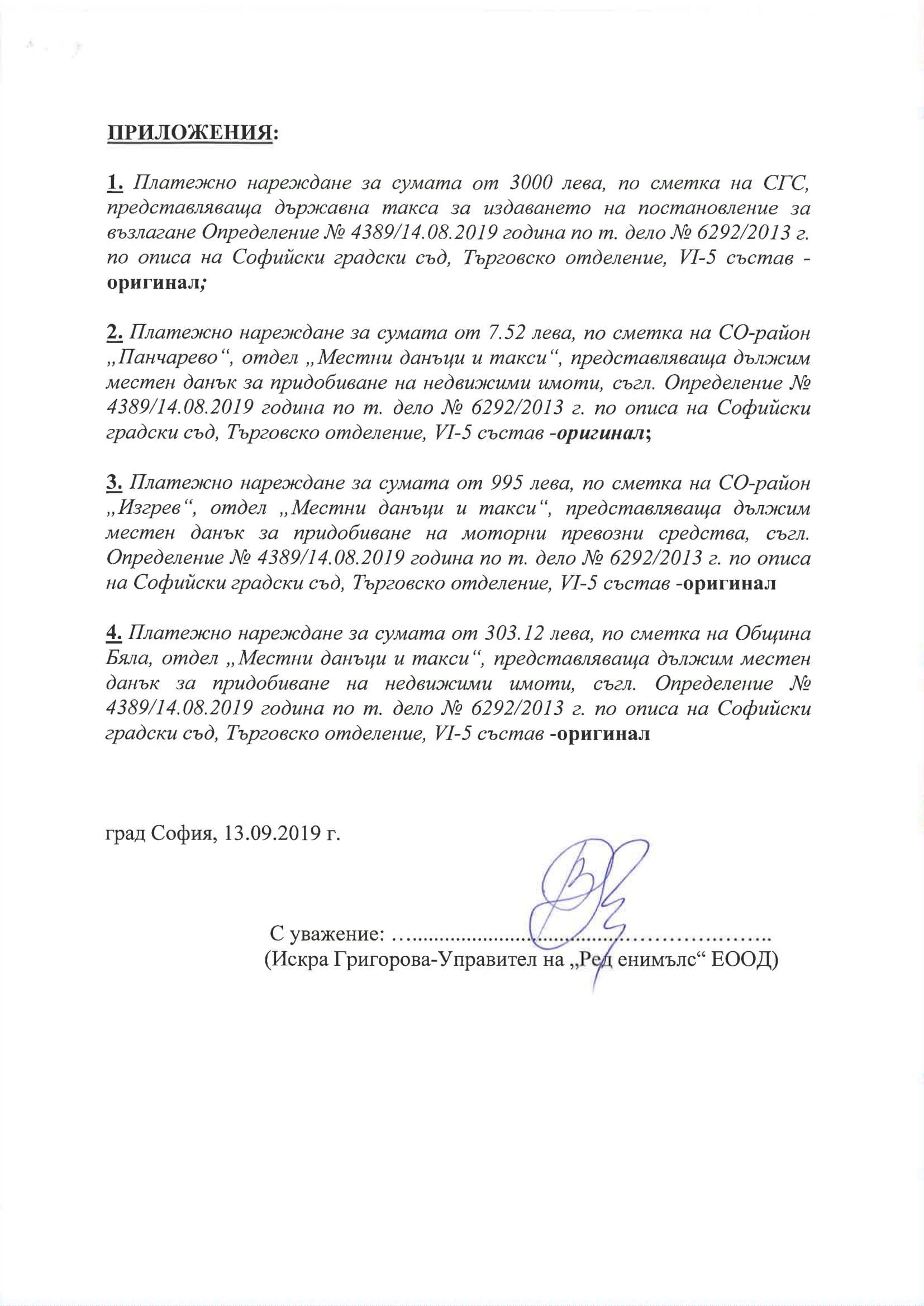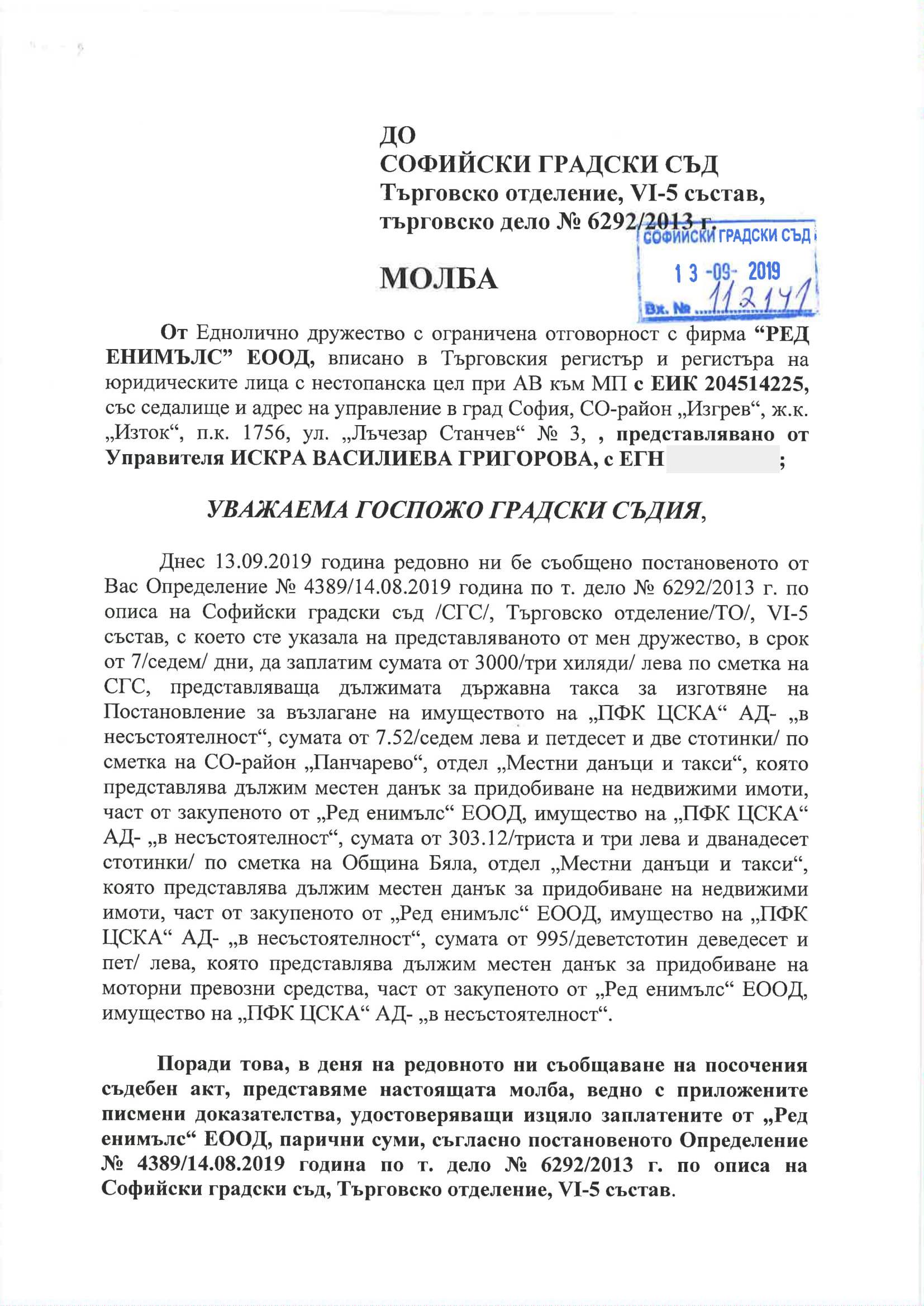 Днес сдружение " Ред Енимълс " ЕООД заплати напълно и в избрания от закона период всички такси за издаването на правосъден акт, с който следва да му бъдат трансферирани в благосъстоятелност всички активи на банкрутиралото сдружение " ПФК ЦСКА АД " - " в неплатежоспособност ".