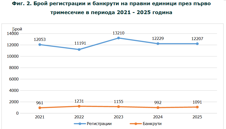 Ръст на банкрутите от 10% регистрира Национален статистически институт за първото тримесечие на тази година по отношение на същия интервал през 2024 година От януари до март 2025 година влезлите в процедура по неплатежоспособност (фалит) компании, включително и оповестените в неплатежоспособност, са 1091. Преди година за първото тримесечие те са били 992.