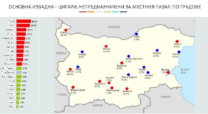 Ръстът е от 4,7% на 5,3 на 100. Увеличава се и размера на противозаконни цигари по обособени градове. Абсолютен връх в контрабандата държи Свиленград, където тя доближава 32%.