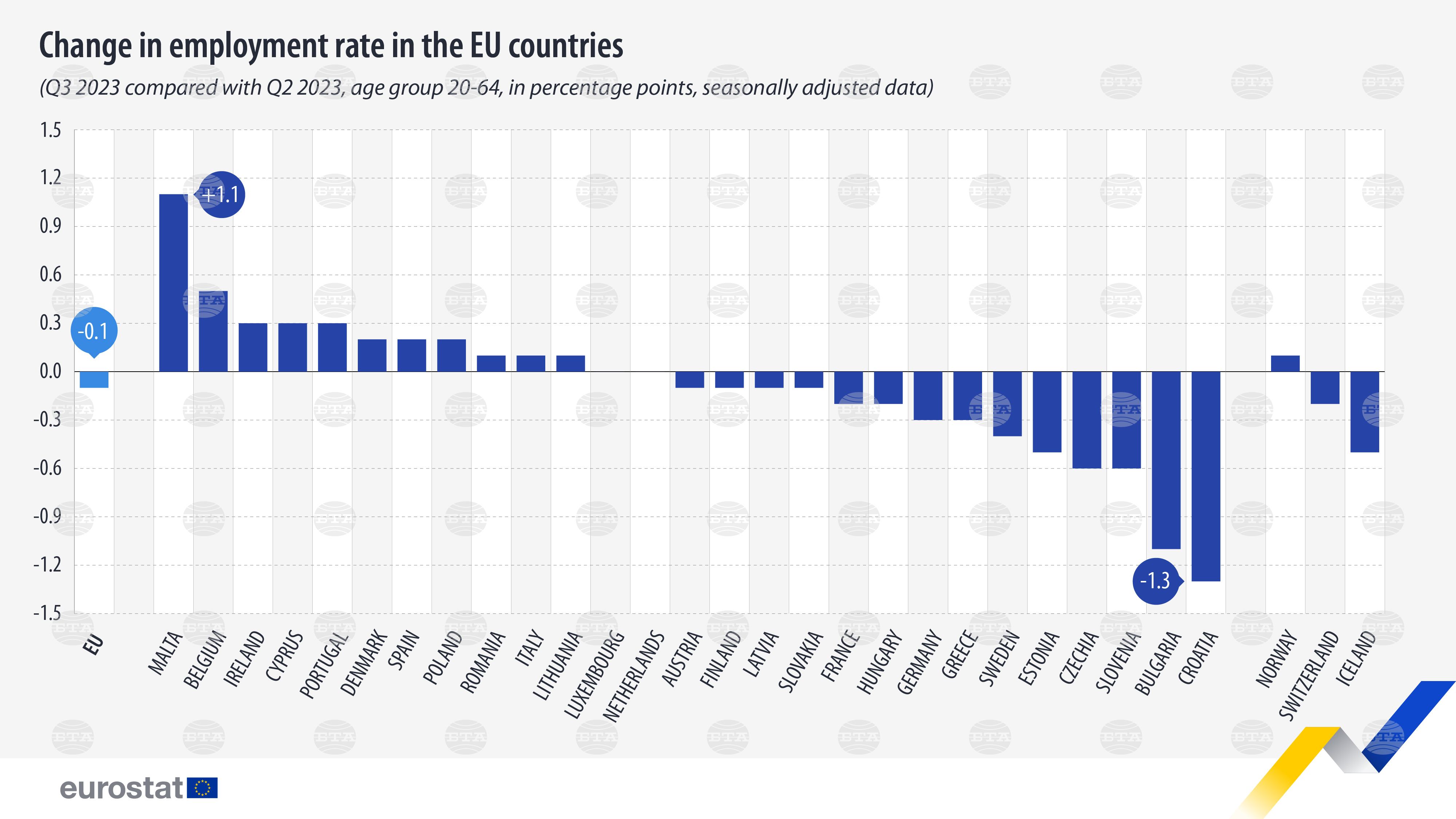 Спад на заетостта в ЕС през третото тримесечие на 2023 г., отчита Евростат