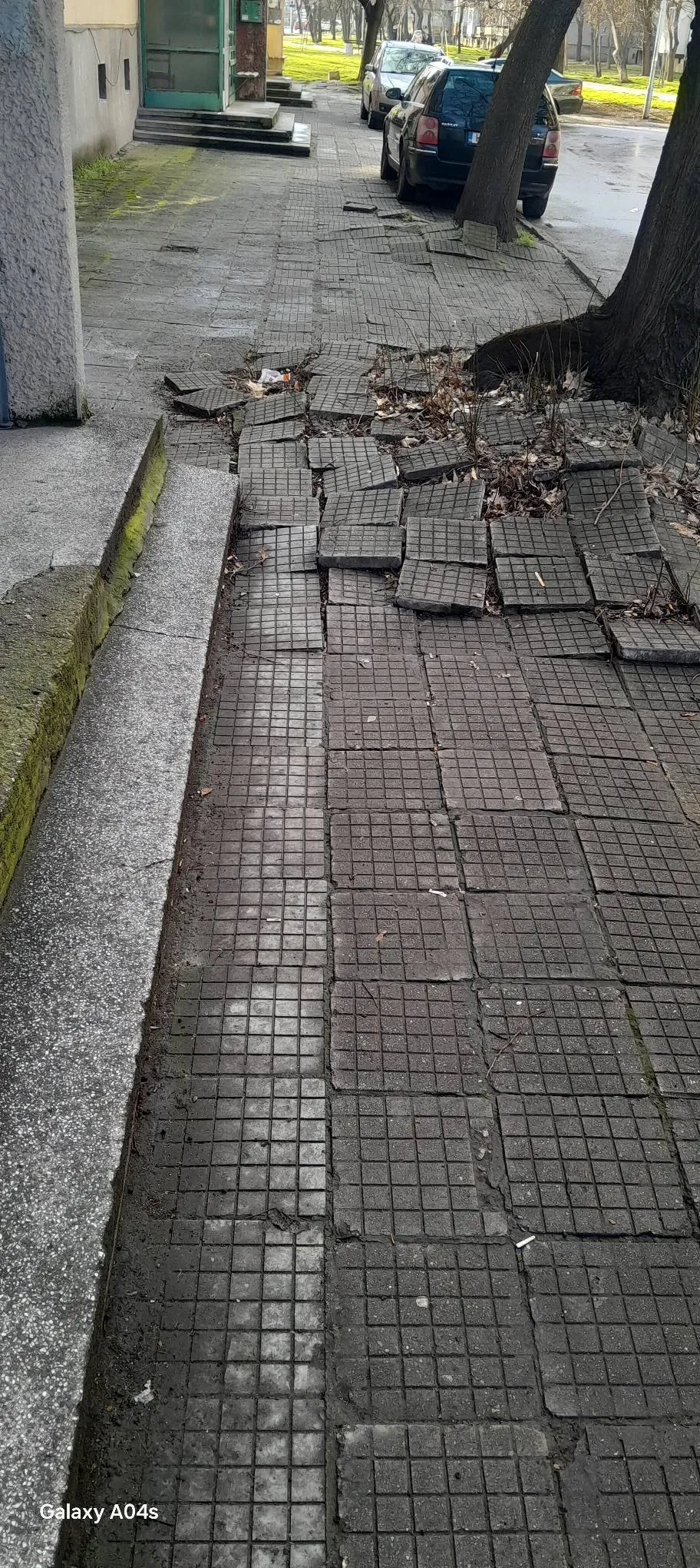 От оповестената фотография се вижда, че настилката е съществено компрометирана. Част от плочките са разместени и повдигнати, други са пропаднали, а в сектора към дърветата се е образувала неравна и евентуално рискова зона. На места тротоарът е изцяло разрушен, което основава действителен риск от попречване и рухване, изключително за възрастни хора, деца и майки с колички.