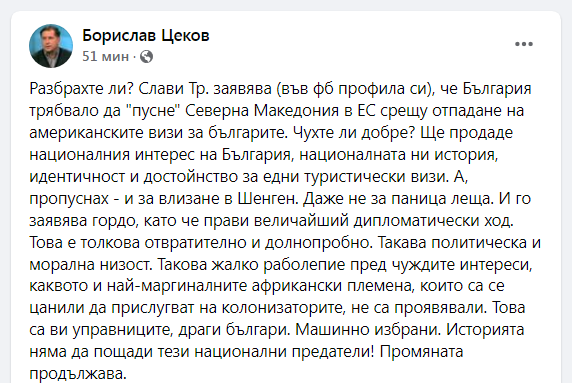 Разбрахте ли? Слави Тр. декларира (във фб профила си), че България трябвало да " пусне " Северна Македония в Европейски Съюз против отпадане на американските визи за българите. Чухте ли добре? Ще продаде националния интерес на България, националната ни история, еднаквост и достолепие за едни туристически визи. Това написа юристът Борислав Цеков в профила си във Facebook. Повод за коментара му е следващата " позиция " на водача на Има Такъв Народ, който юначен се изцепи, че би трябвало да изтъргуваме Македония против визи за Съединени американски щати.