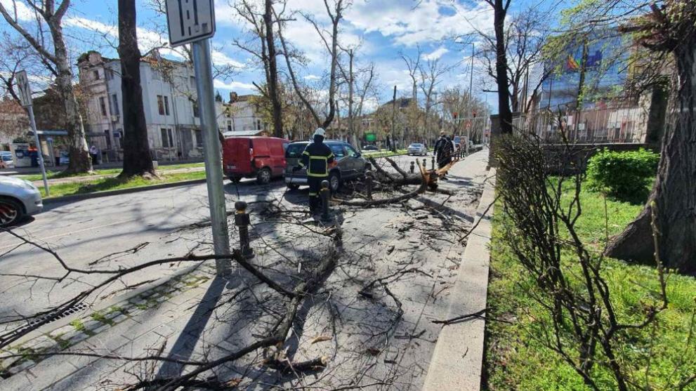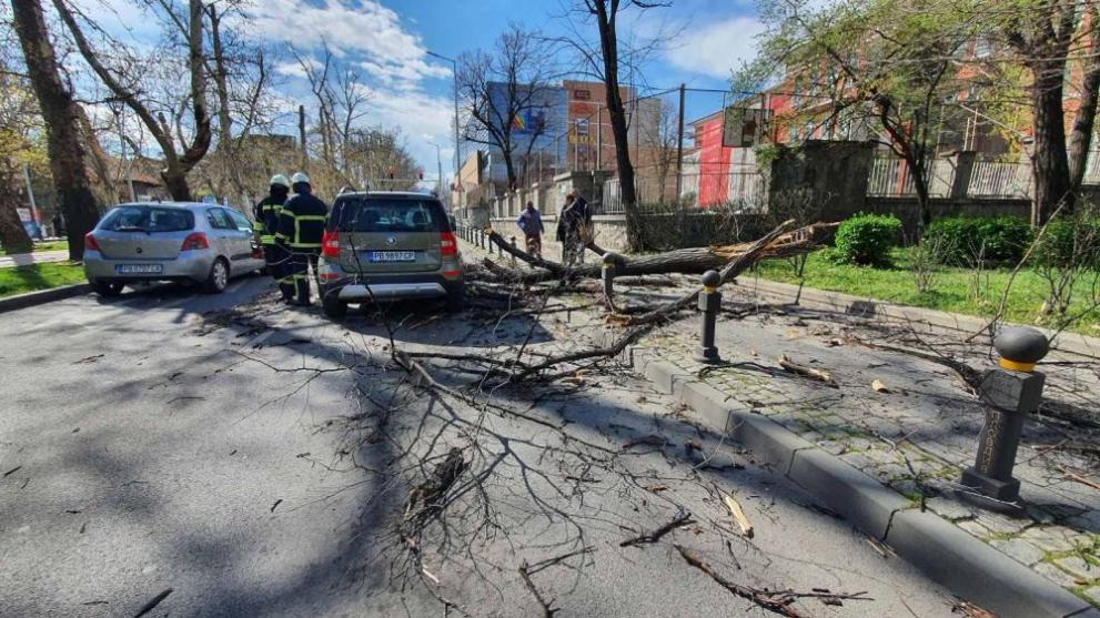 Паднали дървета и клони върху коли и пътното платно, висящи ламарини, неукрепени билбордове и осведомителни табели - са единствено част от подадените сигнали по които чиновниците на пожарна и спасители от бранш СОД работят.