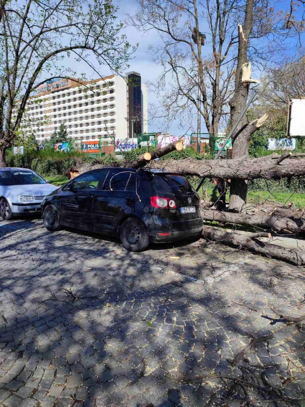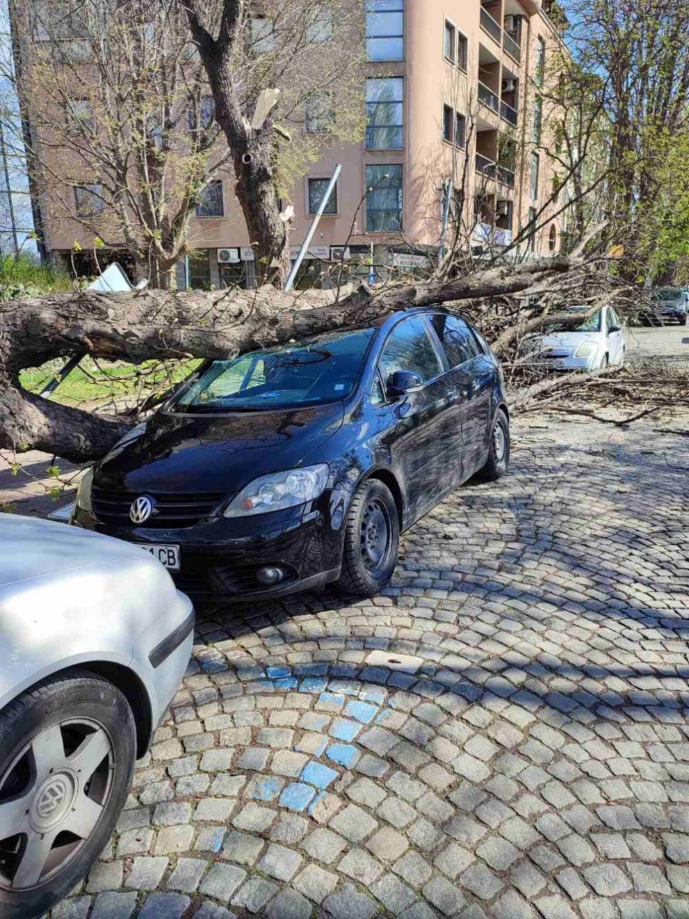 След силния вятър в Пловдив: Паднали дървета, смазани коли и висящи ламарини