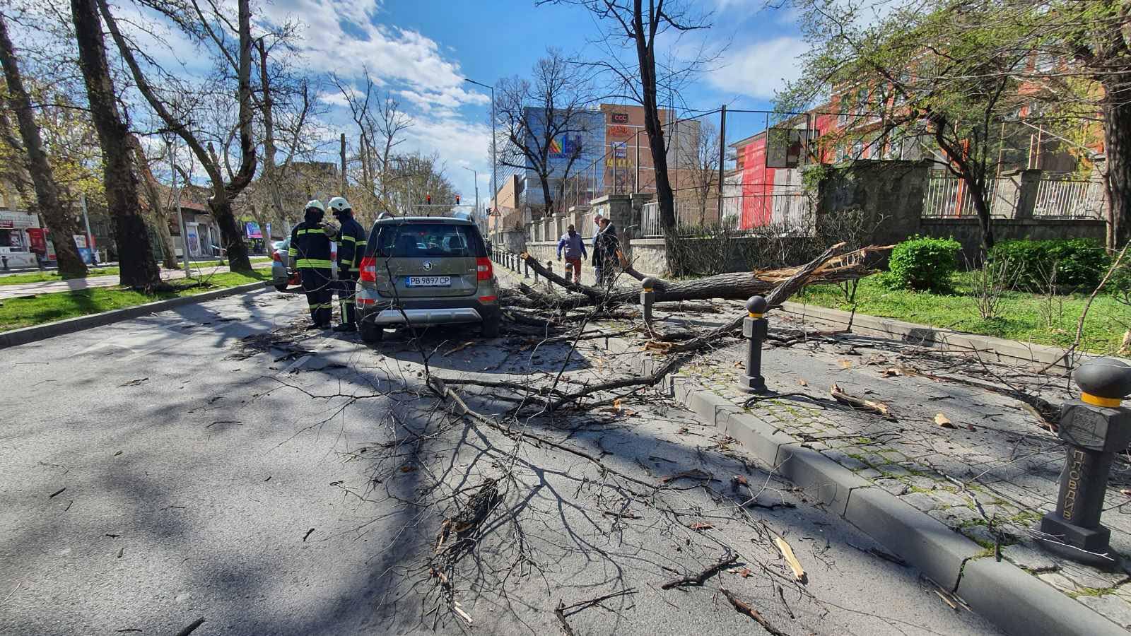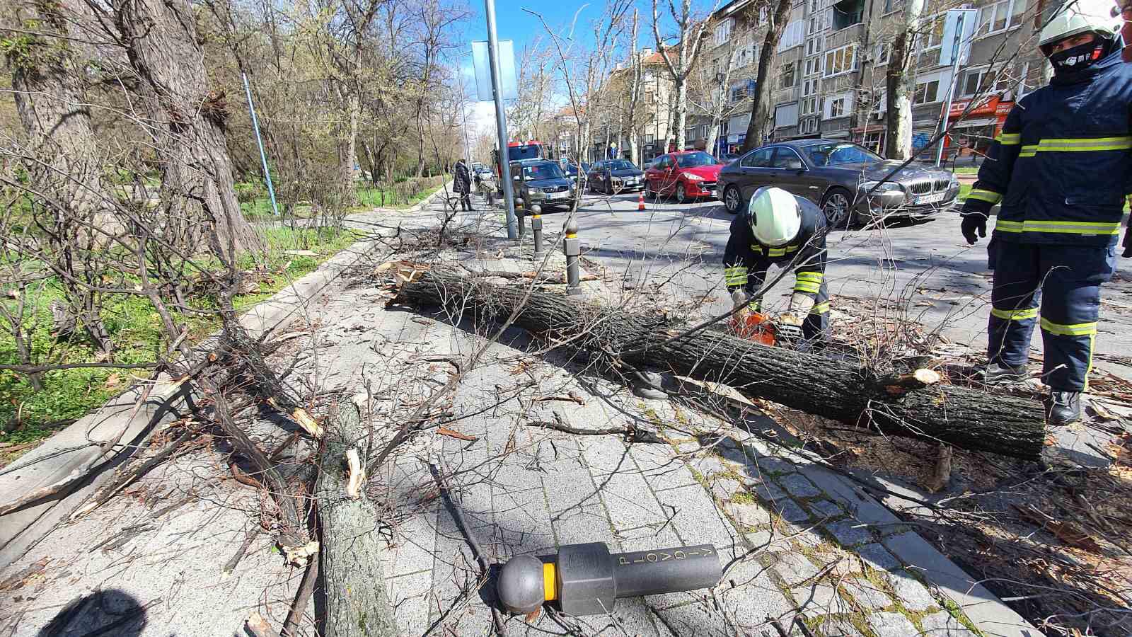 Паднали дървета и клони върху коли и пътното платно, висящи ламарини, неукрепени билбордове и осведомителни табели- са единствено част от подадените сигнали по които чиновниците на пожарна и спасители от бранш СОД работят.