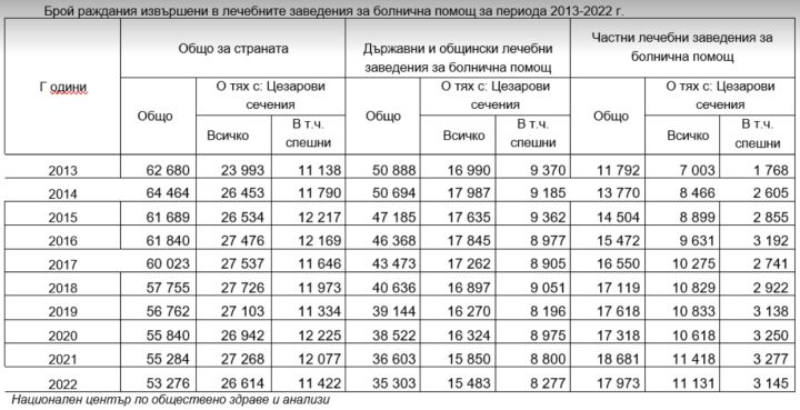 Така през 2022 година 50% от всички 53 276 раждания у нас или 26 614 са с цезарово сечение, като едвам 11 422 са били по неотложност. За съпоставяне, през 2019 от 56 762 раждания у нас 27 103 са били секцио, от които 11 334 по спешност; през 2020 година общо ражданията са били 55 840, от които с цезарово сечение са били 26 942, като от тях 12 225 са по неотложност, а през 2021 от 55 284 раждания 27 268 са били с цезарово сечение, от които 12 077 по неотложност.