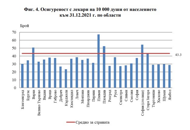 Осигуреността на популацията с лекари по области варира от 23.4 до 67.3 на 10 000 души, като най-висока е в областите, в чиито центрове има медицински университети и академични лечебни заведения (фиг. 4) - Плевен (67.3 на 10 000 души от населението), София (столица) (54.5), Пловдив (52.3) и Варна (50.7). Най-нисък е индикаторът за областите Кърджали (23.4 на 10 000 души от населението), Добрич (26.7) и Силистра (27.4). Осигуреността с общопрактикуващи лекари за страната е 5.8 на 10 000 души от популацията и спрямо 2020 година остава непроменена. Най-висок е индикаторът за областите Плевен (8.2 на 10 000 души), Видин (7.0) и Стара Загора (6.8). Най-ниска е осигуреността на популацията с общопрактикуващи лекари в областите Кърджали (3.2 на 10 000 души от населението), Търговище (4.3) и Разград.