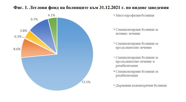 Заведенията за болнична помощ включват лечебни заведения, центрове за кожно-венерически болести, центрове за психологично здраве и сложни онкологични центрове. Към 31.12.2021 година многопрофилните лечебни заведения са 182 с 38 418 кревати, или в 57.1% от лечебните заведения е концентриран 73.5% от легловия им фонд в страната . Броят на леглата варира в необятни граници - от 27 до 1 546. Найголям е делът на многопрофилните лечебни заведения, които към края на годината разполагат с от 100 до 299 кревати - 42.9%. До 99 кревати има в 35.2% от многопрофилните лечебни заведения. С над 500 кревати са 8.2% от този тип лечебни заведения. Към 31.12.2021 година профилираните лечебни заведения са 137 с 13 828 кревати.