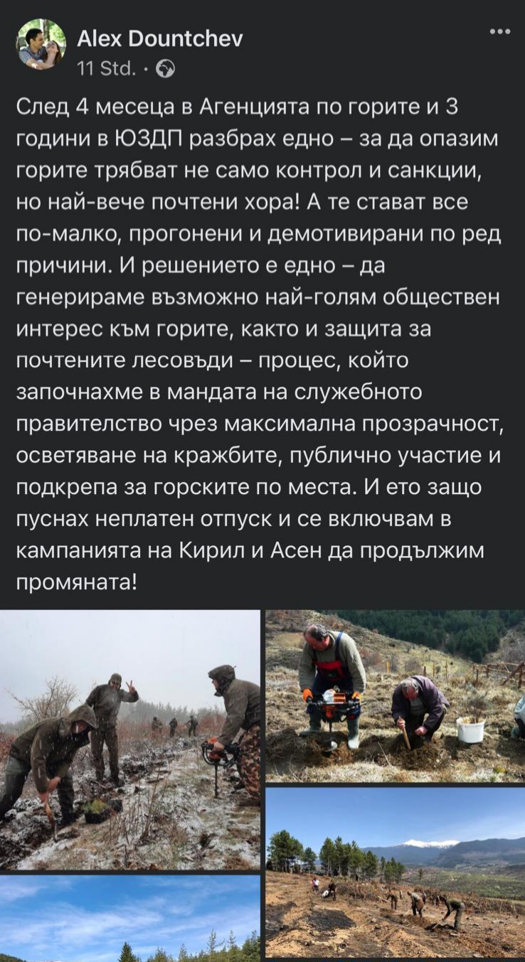 " След 4 месеца в Агенцията по горите и 3 години в ЮЗДП разбрах едно – с цел да опазим горите трябват освен надзор и наказания, само че най-много честни хора! А те стават все по-малко, прогонени и демотивирани по ред аргументи. И решението е едно – да генерираме допустимо максимален публичен интерес към горите, както и отбрана за почтените лесовъди – развой, който започнахме в мандата на служебното държавно управление посредством оптималната бистрота, осветление на кражбите, обществено присъединяване и поддръжка за горските по места. И ето за какво пуснах неплатен отпуск и се включвам в акцията на Кирил и Асен да продължим смяната! ".