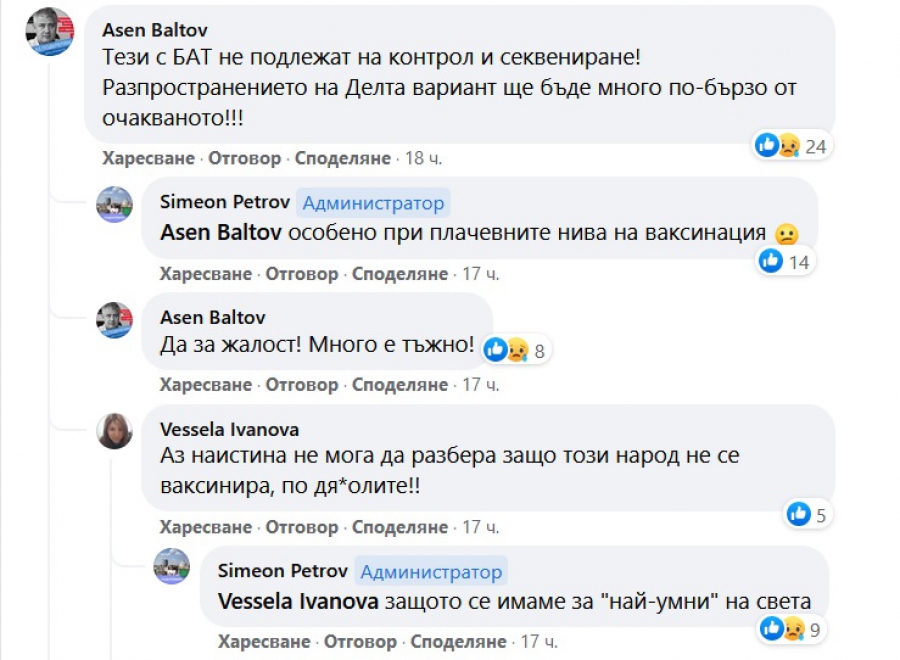Проф. Балтов разяснява тематиката в профилираната фейсбук група Science in the Crisis, където всекидневно бива съобщавана и коментирана настоящата информация за епидемиологичната конюнктура в България що се отнася до COVID-19. Още преди два дни Балтов написа в персоналния си профил във Facebook апел да се имунизираме против ковид - към днешна дата малко над 11% от популацията в България има напълно приключена имунизация против заболяването.