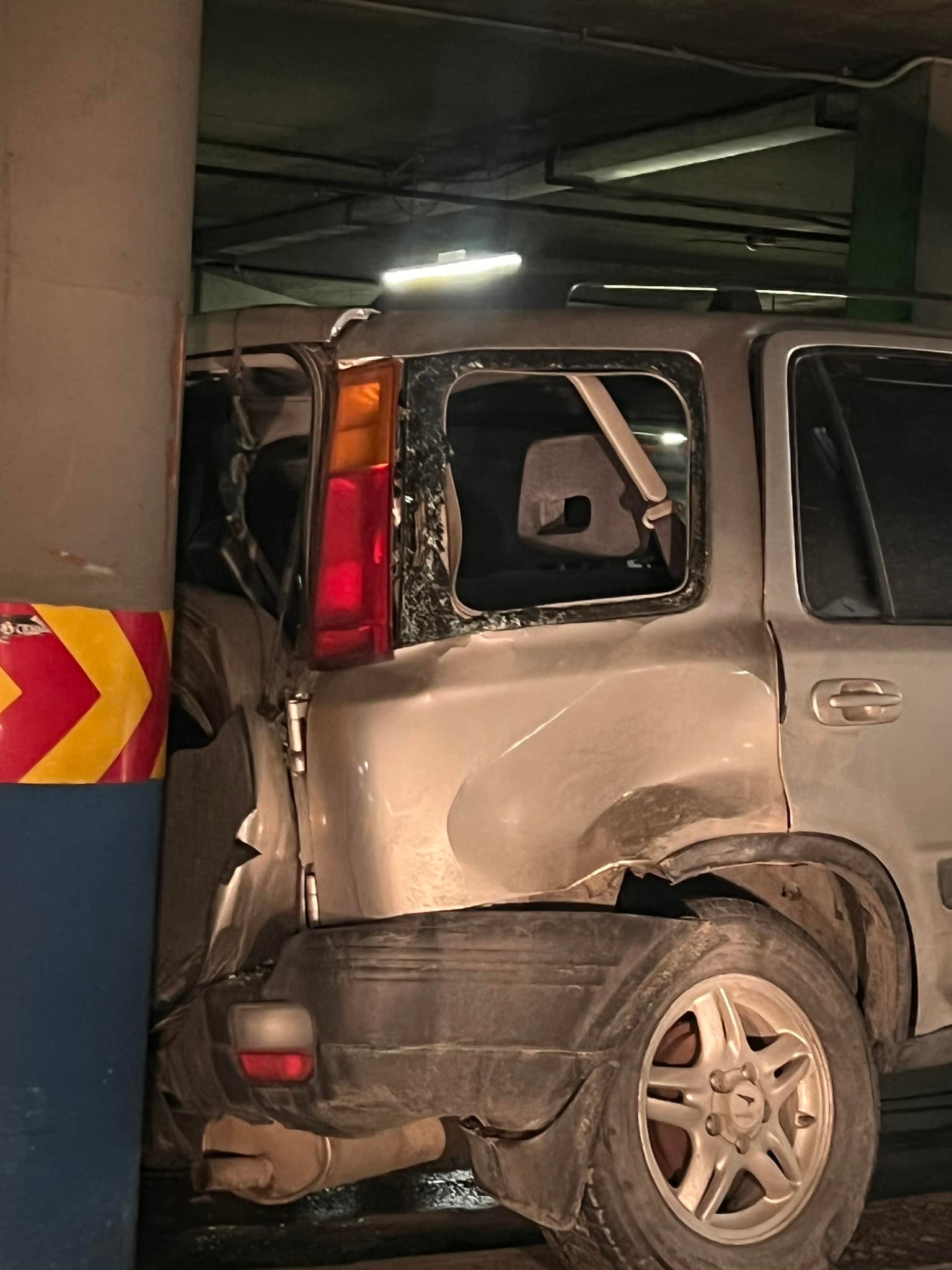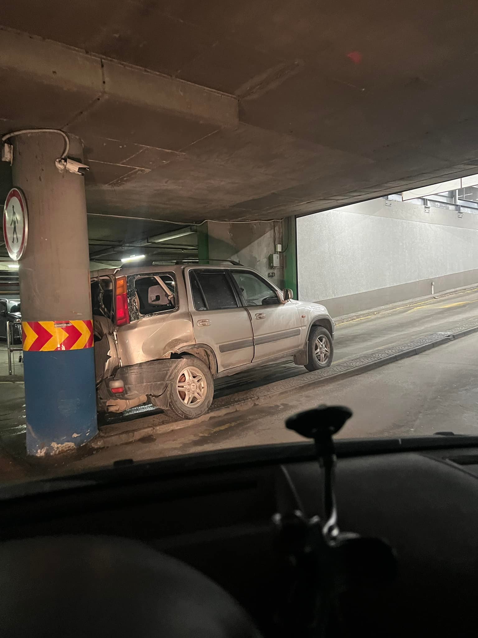 Автомобилът е тръгнал назаден ход, надолу в паркинга на комерсиалния център и се е врязал в колона. Нанесени са обилни вреди по колата, само че за благополучие не имало други коли и няма потърпевши.