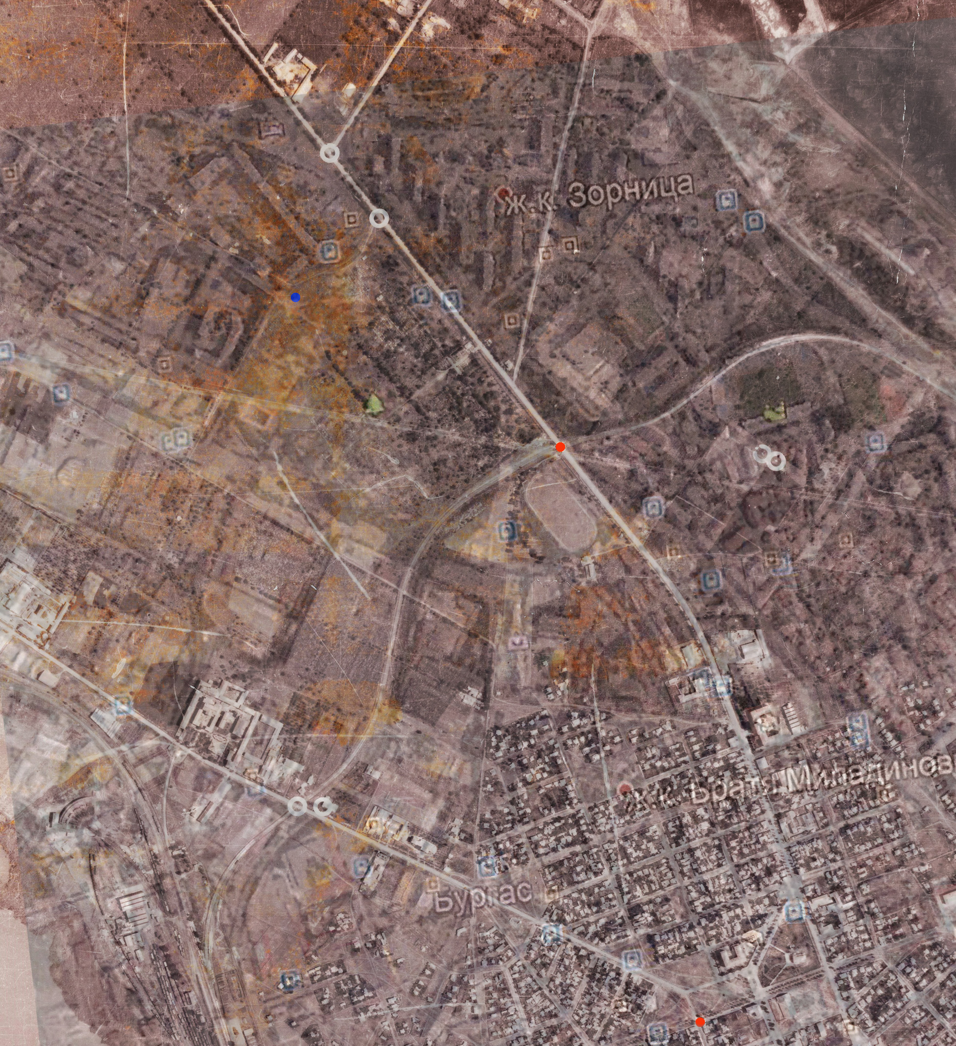 Това са две карти на Бургас от два разнообразни интервала - от 1944 година и от наши дни (Google Maps). Със синя точка е отбелязно мястото на общия гроб, оголен от Митко Иванов през днешния ден. Функцията на алените точки, които участват и на двете карти, насложени една върху друга, е да работят като ориентир, който да потвърждава точността на смесеното от двете карти изображение