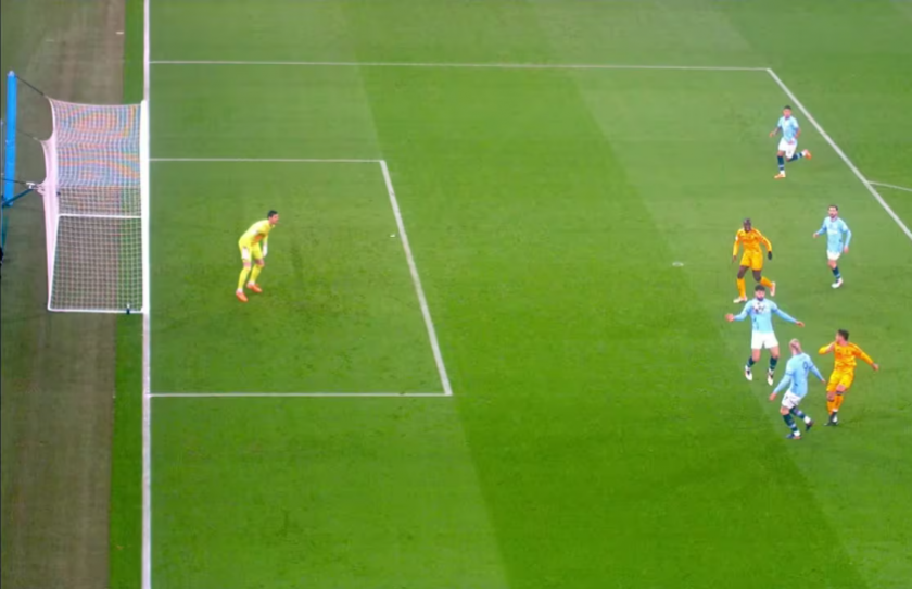 Секунди след повновяването на играта Раул Асенсио сгреши при изнасянето на топката, Савиньо комбинира с Кевин Де Бройне, който изведе Ерлинг Холанд, норвежецът нанесе удар, който рикошира в Едуардо Камавинга и срещна напречната греда, след което бе отсъдена засада на състезател на Сити.
