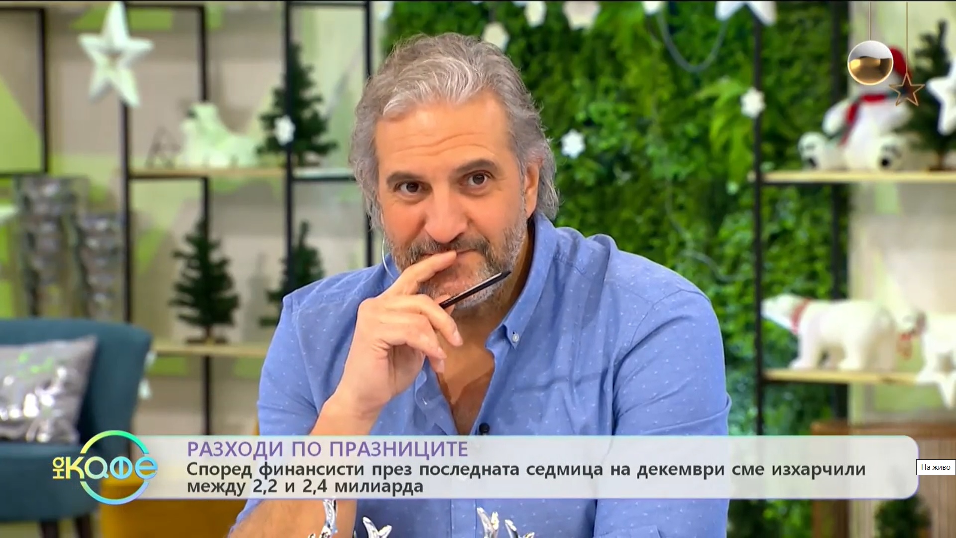Интересна полемика протече в предаването " На кафе " по " Нова телевизия ". Темата зададе писателят Илиян Любомиров, който цитира ститистика, съгласно която българите са похарчили сред 2,2 и 2,4 милиарда лв. по коледните и новогодишните празници. Средната стойност на подарък, който купуваме на най-близките си, пък е 50 лв..