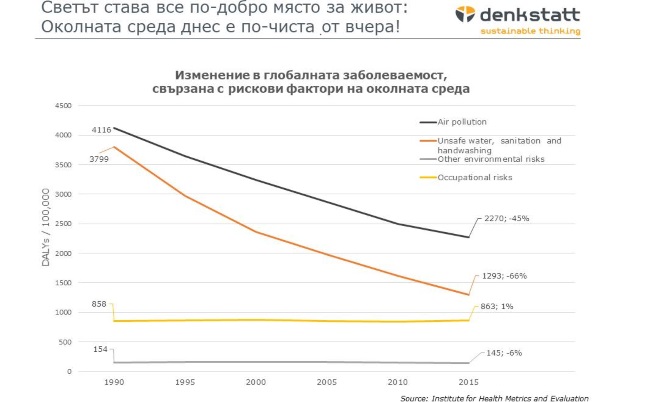 Ако не ви се четат учебници по история на положението на околната среда, хвърлете взор върху данните в уеб страницата Our World in Data – ще се шокирате какъв брой огромно е разминаването сред усещанията и действителното състояние. Прилагам единствено един образец - данните за световния спад на заболеваемостта, обвързвана със замърсяване на разнообразни съставни елементи на околната среда в интервала 1990-2015 година (на графиката).