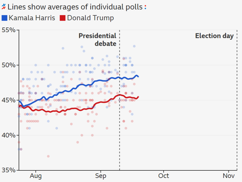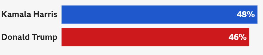 Според социологическо изследване, споделено от BBC, за момента отговорът е, че Съединени американски щати ще получи първата си жена президент. Но резултатите са доста близки - Харис получава приблизително 48% от гласовете, до момента в който някогашният президент - 46%.