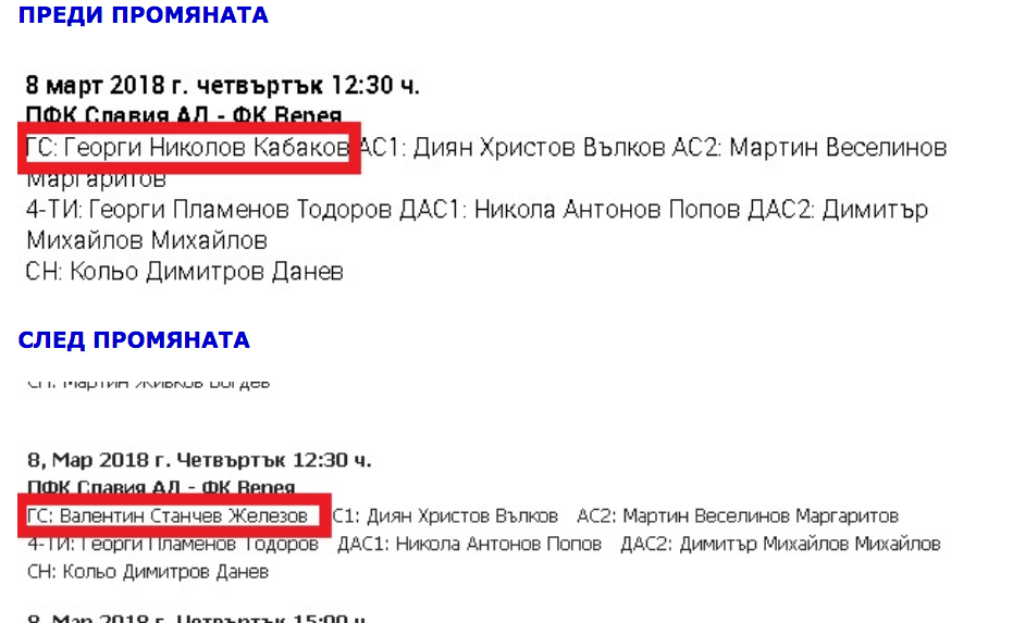 Часове по-късно Георги Кабаков беше сменен с Валентин Железов. Останалите съдии от бригадата за мача в Стара Загора си остават същите.