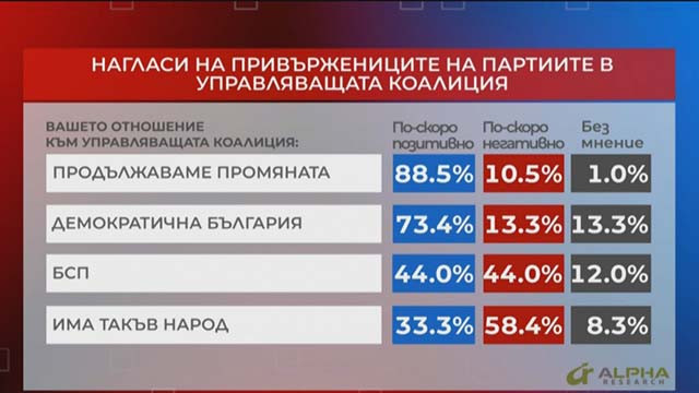 Сред симпатизантите на четирите партии в обединението най-високо утвърждение за нея дават последователите на „ Продължаваме промяната “ – 88.5%, следвани от „ Демократична България “ със 73.4%. Мненията на симпатизантите на Българска социалистическа партия са спорни – колкото я утвърждават, толкоз не я утвърждават. При „ ИТН “ – 58.4% от последователите им към този момент са отрицателно настроени към ръководещата коалиция.