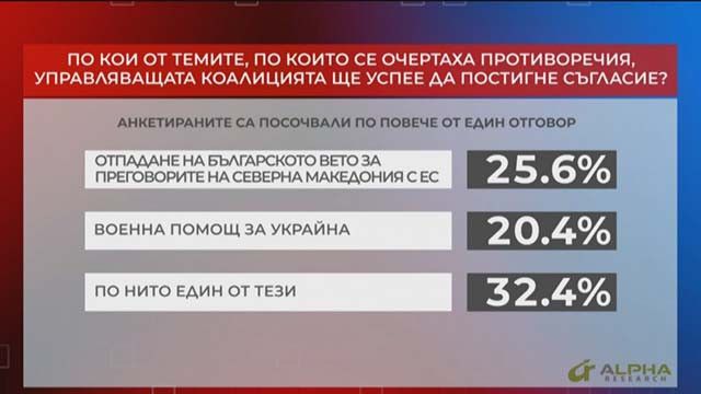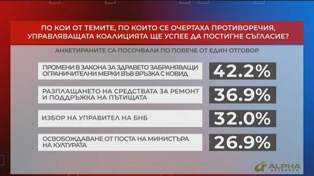 На въпроса По кои от тематиките, по които се обрисуваха несъгласия, ръководещата коалиция ще успее да реализира единодушие? – 42.2% дават отговор, че обединението ще реализира единодушие за измененията в закона за здравето, забраняващи ограничаващи ограничения по отношение на Ковид, следвани от разрешаването на проблемите в Агенция „ Пътна инфраструктура “ и избора на гуверньор на Българска народна банка. Най-трудните проблеми за разрешаване за четирите партии в обединението ще са даване на военна помощ за Украйна и позицията за Република Северна Македония, сочат резултатите от допитването.