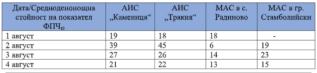 Към днешна дата има задоволително данни, с цел да бъдат установени средноденонощните стойности във връзка с част от индикаторите. Резултатите от анализа на данните за двете автоматизирани измервателни станции в гр. Пловдив (АИС „ Каменица “ и АИС „ Тракия “) и мобилните автоматизирани станции (МАС) в с. Радиново и в гр. Стамболийски “ за четирите минали денонощия демонстрират, че няма превишения на средночасовите и средноденонощните пределни правила при нито един от следените замърсители, включително по повод концентрациите на фини прахови частици (ФПЧ 10 ) и бензен.