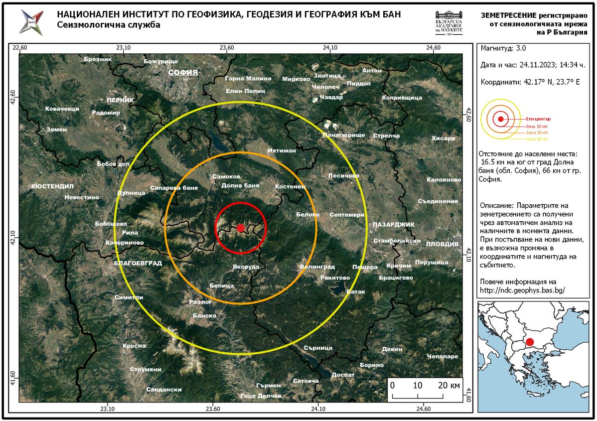 Регистрираха земетресение преди минути у нас. То е с магнитуд от 3 по скалата на Рихтер и е записано в Благоевградско. Дълбочината на труса е 14 километра, регистрирано в 14:34 часа. Епицентърът е на 16,5 км от Долна Баня.