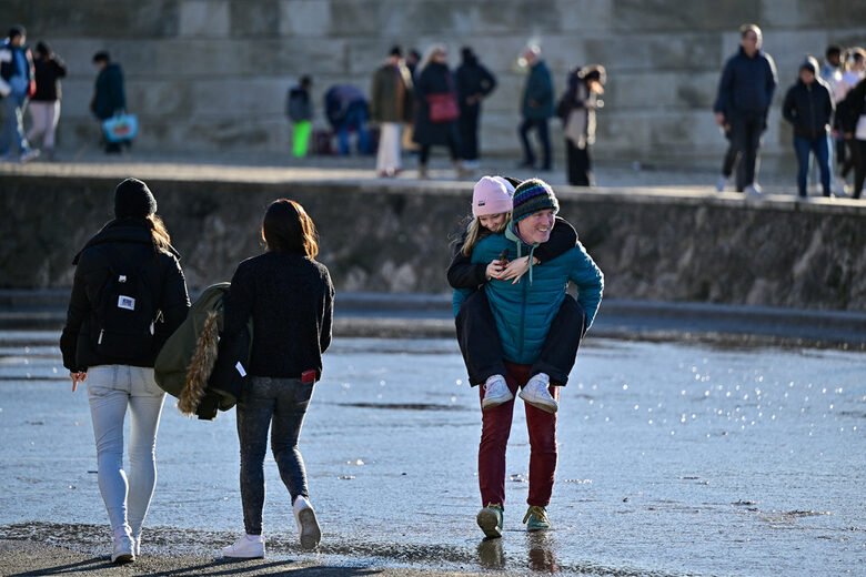 Четвъртък сутринта, 28 декември. Жители на Будапеща се разхождат край прелелите води на реката в центъра на града