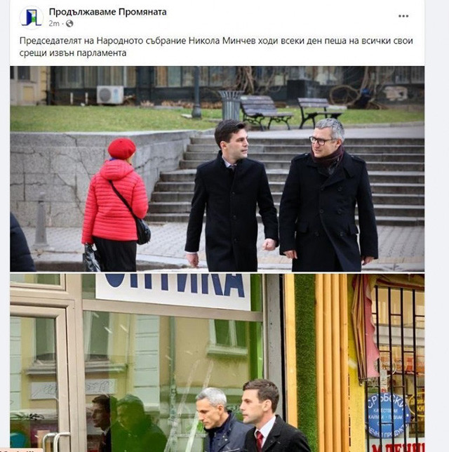 От групировката „ Продължаваме промяната “ пуснаха фотоси на Никола Минчев и двама от депутатите. Според обявата във Facebook шефът на Народното събрание върви пешком на всички свои срещи отвън Народното събрание. Интересно обаче, че не се вижда на никое място защита от НСО, които би трябвало да вървят и те компактно пеш до Минчев, както се видя на видеото на Петков.