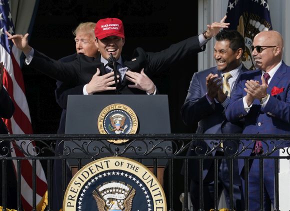 Кърт Сузуки пък показва своята поддръжка към Тръмп, като постави шапка с предизборния слоган от акцията на милиардера през 2016 година – Make America Great Again ( " Направи Америка велика още веднъж " ). В отговор кетчерът получи прегръдка от президента.
