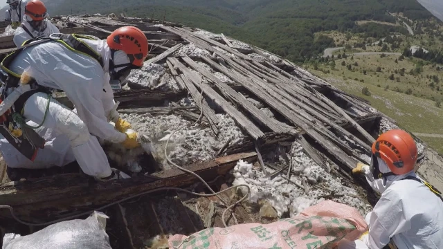 След две години работа по стенните мозайки за първи път дейностите по възобновяване на така наречен " паница " излизат отвън постройката. Екип от 10 алпинисти работи по разчистването на отломките.