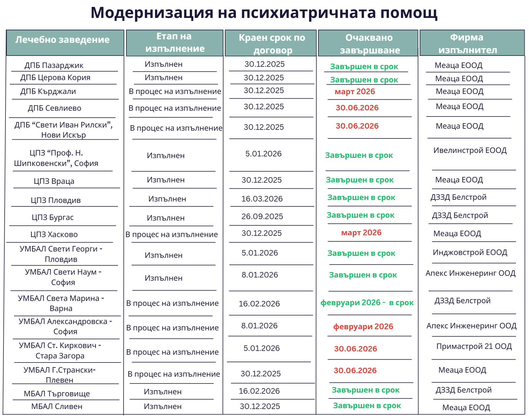 Модернизацията на държавната психиатрична болница в Кърджали трябваше да завърши по контракт на 30 декември 2025 г, само че в този момент се чака ремонтните работи да приключат през март 2026 година През март би трябвало да завърши и ремонтът на Центъра за психологично здраве в Хасково, който също трябваше да бъде приключен до 30 декември 2025 година Ремонтът на Държавната психиатрична болница в Севлиево се бави и вместо в края на предходната година би трябвало да приключи до 30 юни 2026 година И трите лечебни заведения се ремонтират от компанията " Меаца " ЕООД.