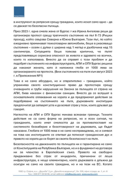 " Този път, по който всекидневно минават тежкотоварни коли, беше в ужасяващо положение – посипан с дупки с широчина над 1 метър и дълбочина над 15 сантиметра. Ситуацията беше толкоз сериозна, че пътят представляваше сериозна заплаха за живота и здравето на всички, които го използваха. Вместо да се оправят с този проблем и да подобрят положението на инфраструктурата, Областно пътно ръководство Бургас реши да накаже дамата, като ѝ наложи санкция от 1000 лв. за организирането на митинга ", пишат от ЕЦТП в своя реакция по случая.