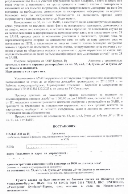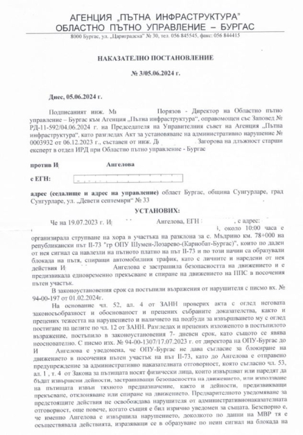 Наказателно разпореждане издадено от ОПУ Бургас против митинга проведен от госпожа Ирена Ангелова/ Европейски център за транспортни политики
