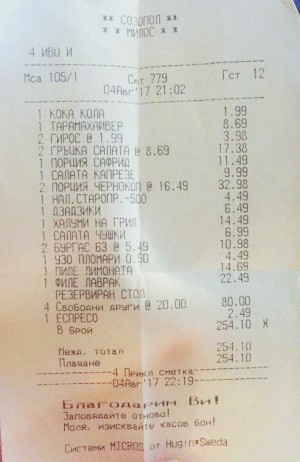 Ресторантьор в Созопол мазета рибата, откакто таксува клиент с по 20 лв. за …”резервиран стол!”. Възмутена жена сподели неповторима касова записка, която показва до каква степен е достигнала изобретателността на родните ресторантьори.