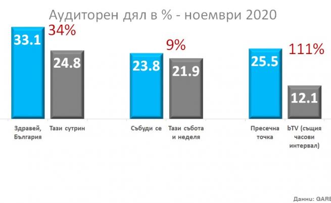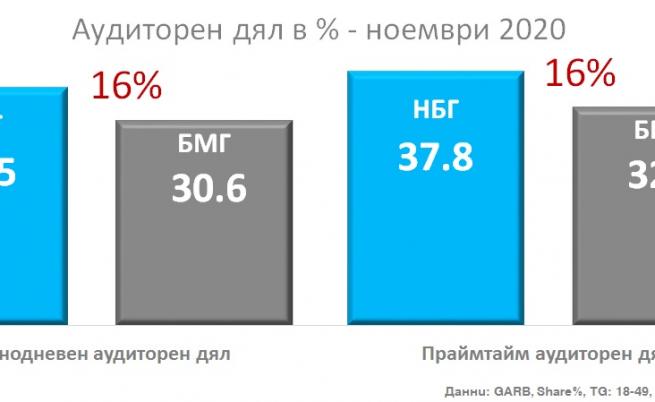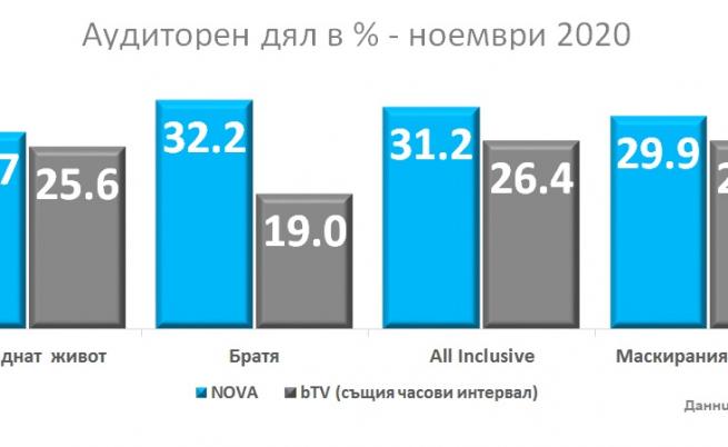 рез ноември NOVA продължава изрично да затвърждава своето водачество и безапелационно показване измежду аудиторията в дейна възраст. Освен сензитивната преднина по отношение на втората по гледаемост телевизия, данните на ГАРБ Аудиенс Межърмент България записват растеж от 4% по отношение на същия месец от миналата година в същата целева група, до момента в който аудиторният дял на bTV по отношение на ноември 2019 спада с 11%. През ноември NOVA реализира с 22% по-голям аудиторен дял от директния си съперник, а в праймтайм със 16%.