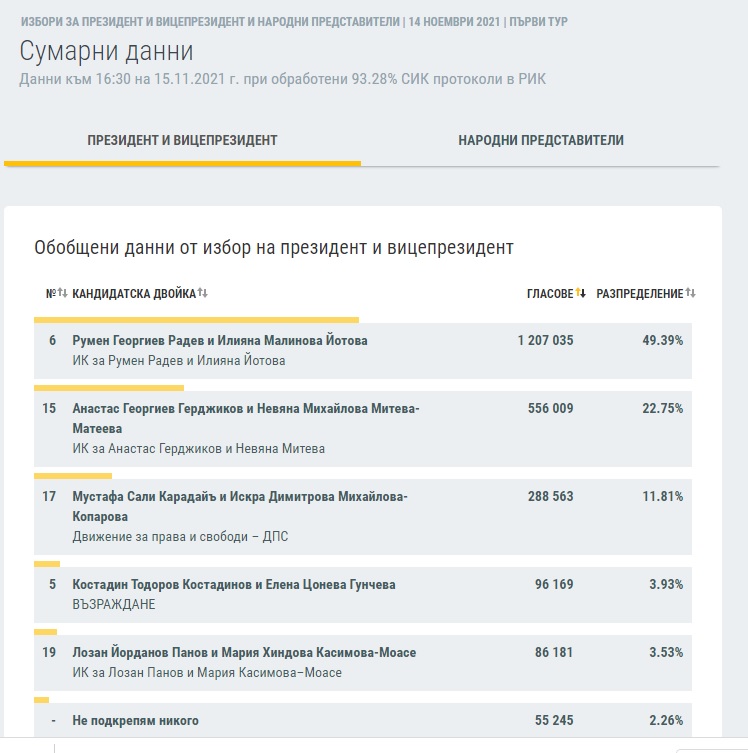 Резултатите на при 93,28% обработени протоколи сочат, че Румен води с по-малко от 27% пред проф. Анастас Герджиков.