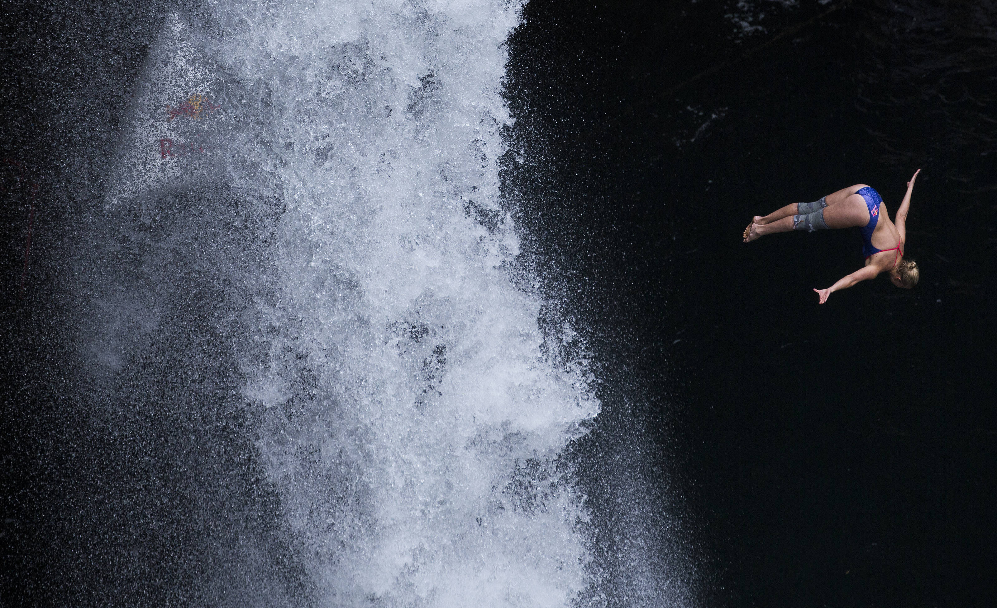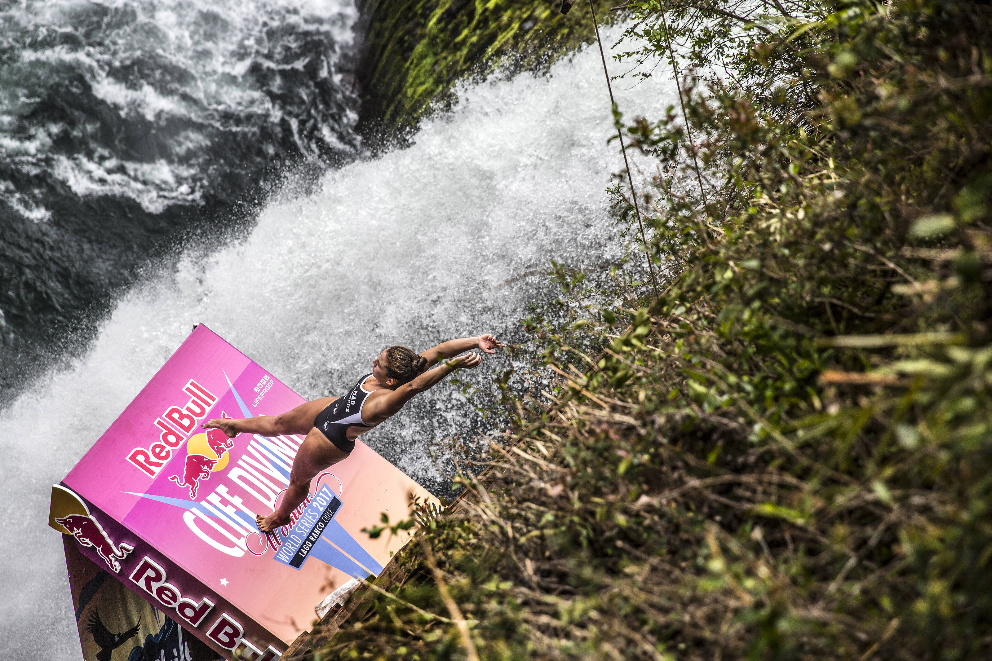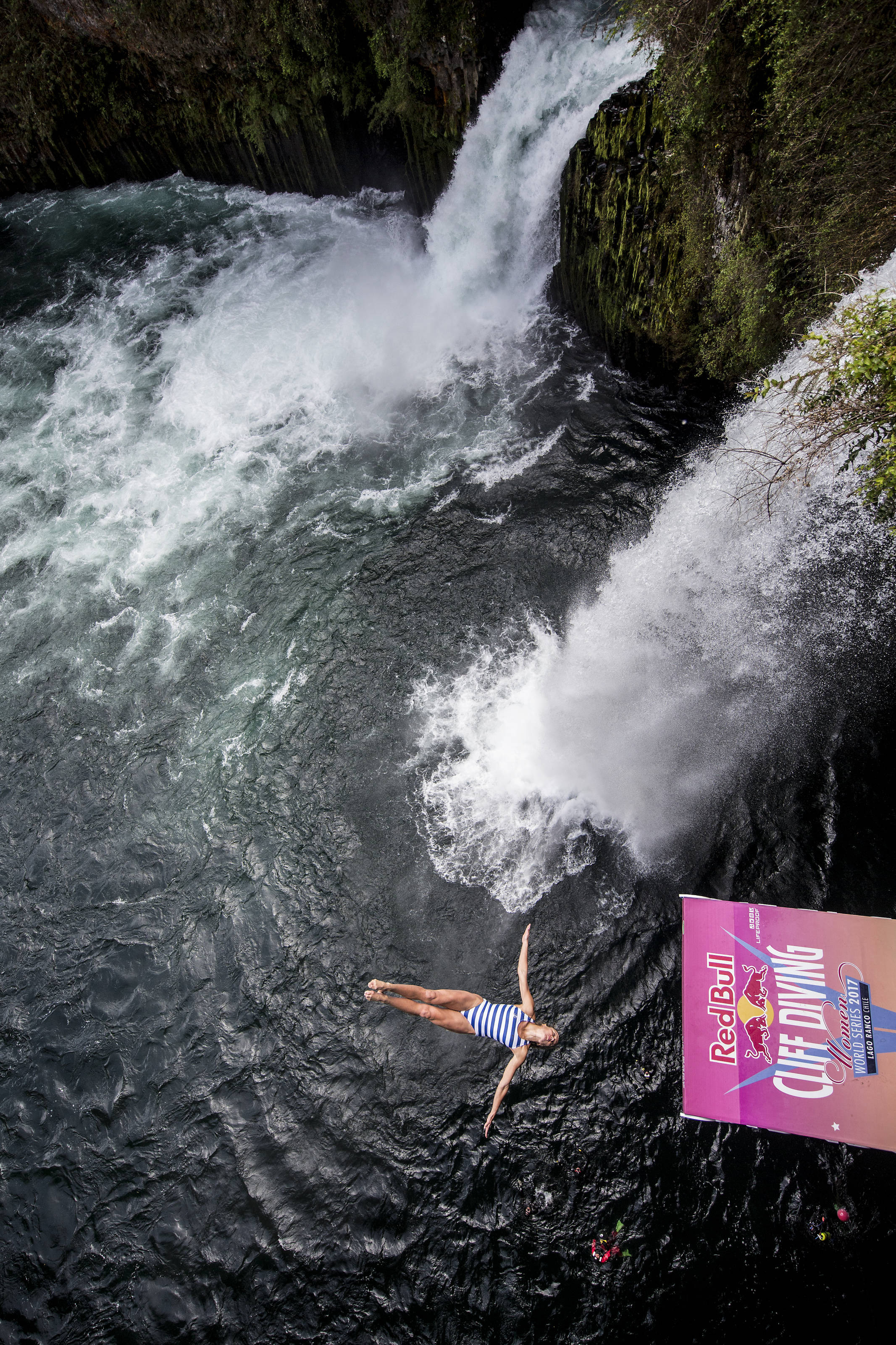 Rhiannan Iffland of Australia dives from the 27 metre platform during the sixth and final stop of the Red Bull Cliff Diving World Series at Rininahue waterfall, Lago Ranco, Chile on October 21, 2017