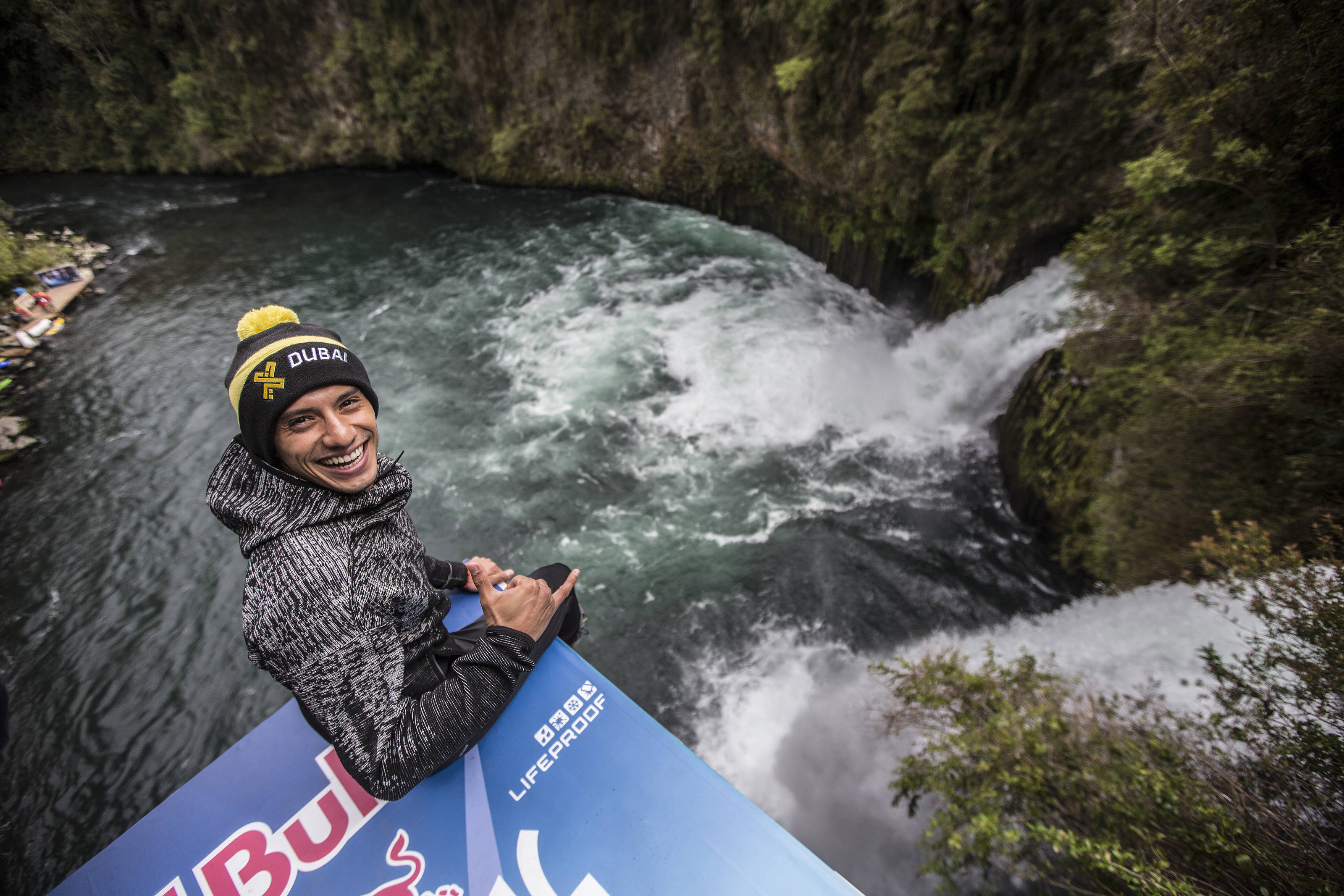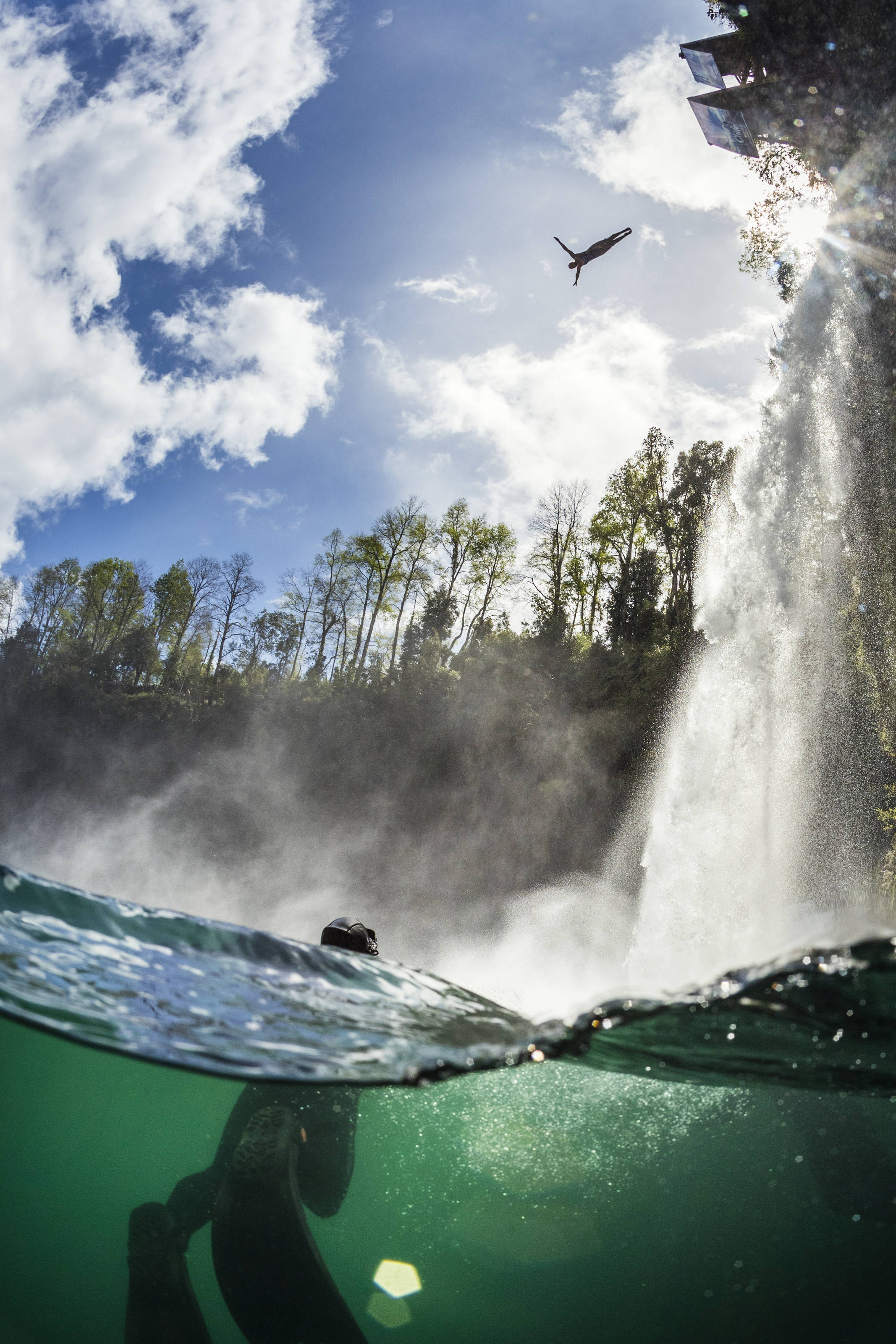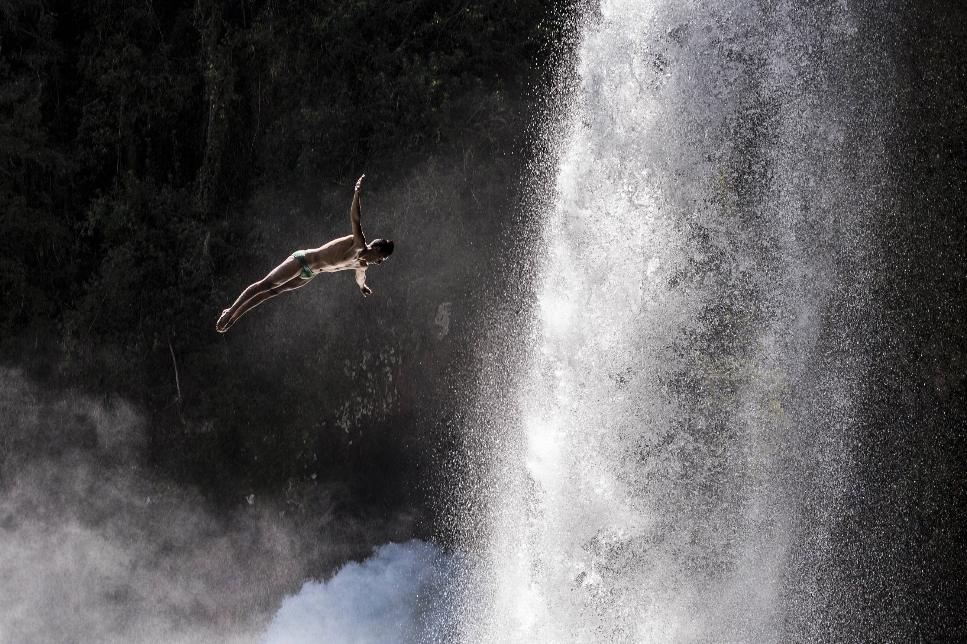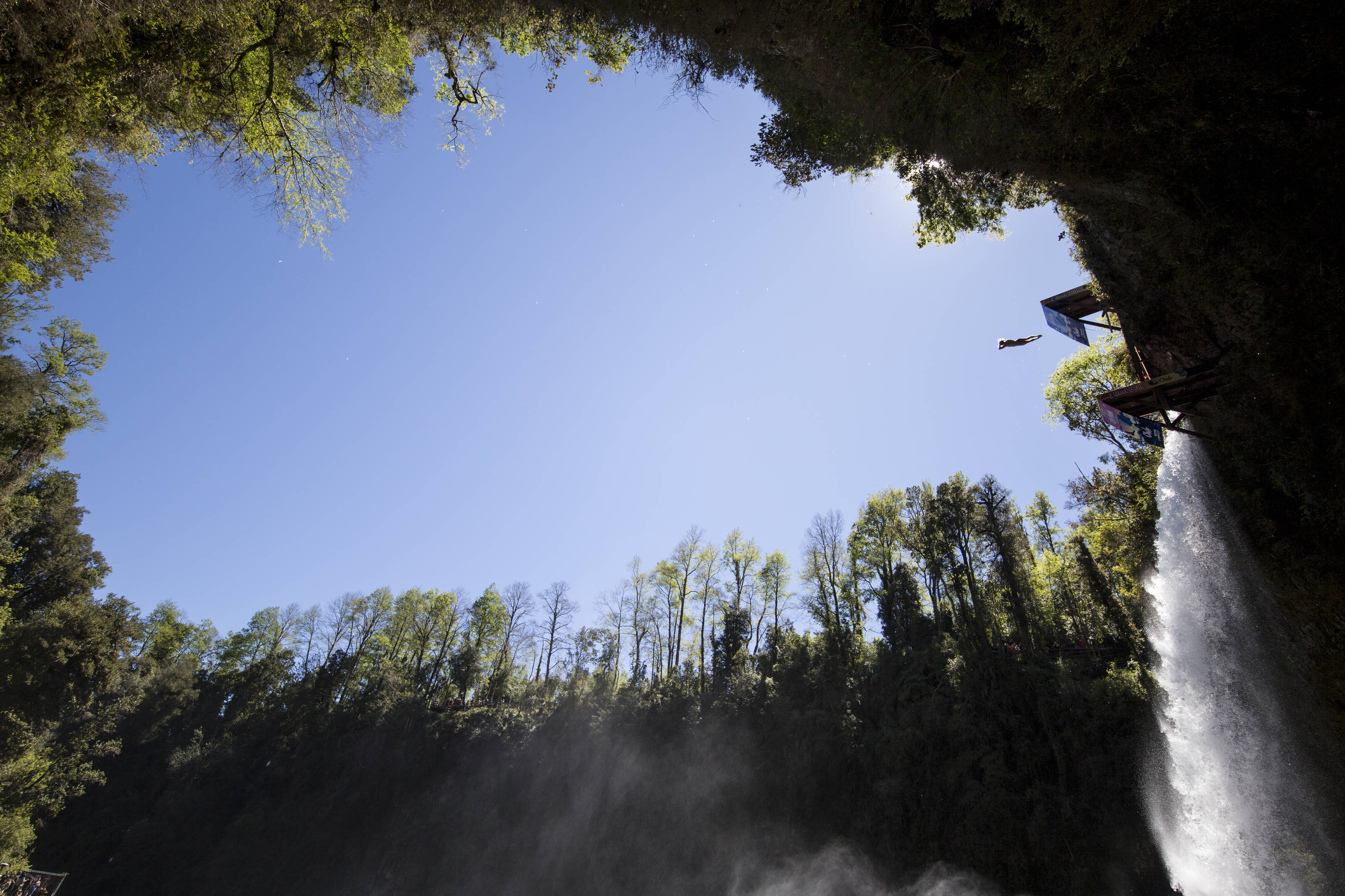 Jonathan Paredes of Mexico dives from the 27 metre platform during the sixth and final stop of the Red Bull Cliff Diving World Series at Rininahue waterfall, Lago Ranco, Chile on October 21, 2017