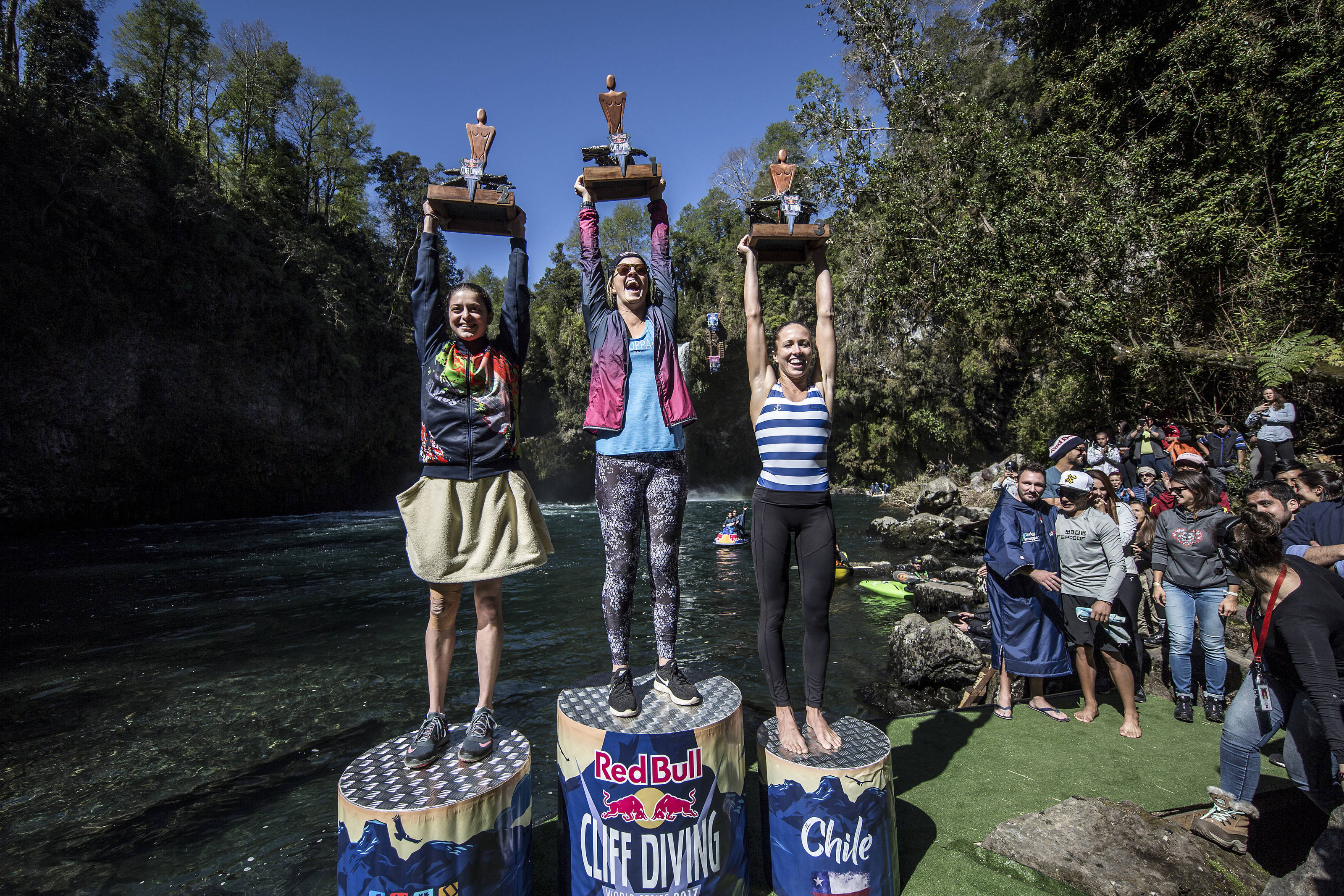 Yana Nestsiarava (L) of Belarus, and Rhiannan Iffland and Helena Merten of Australia celebrate on the podium during the sixth and final stop of the Red Bull Cliff Diving World Series at Rininahue waterfall, Lago Ranco, Chile on October 21, 2017